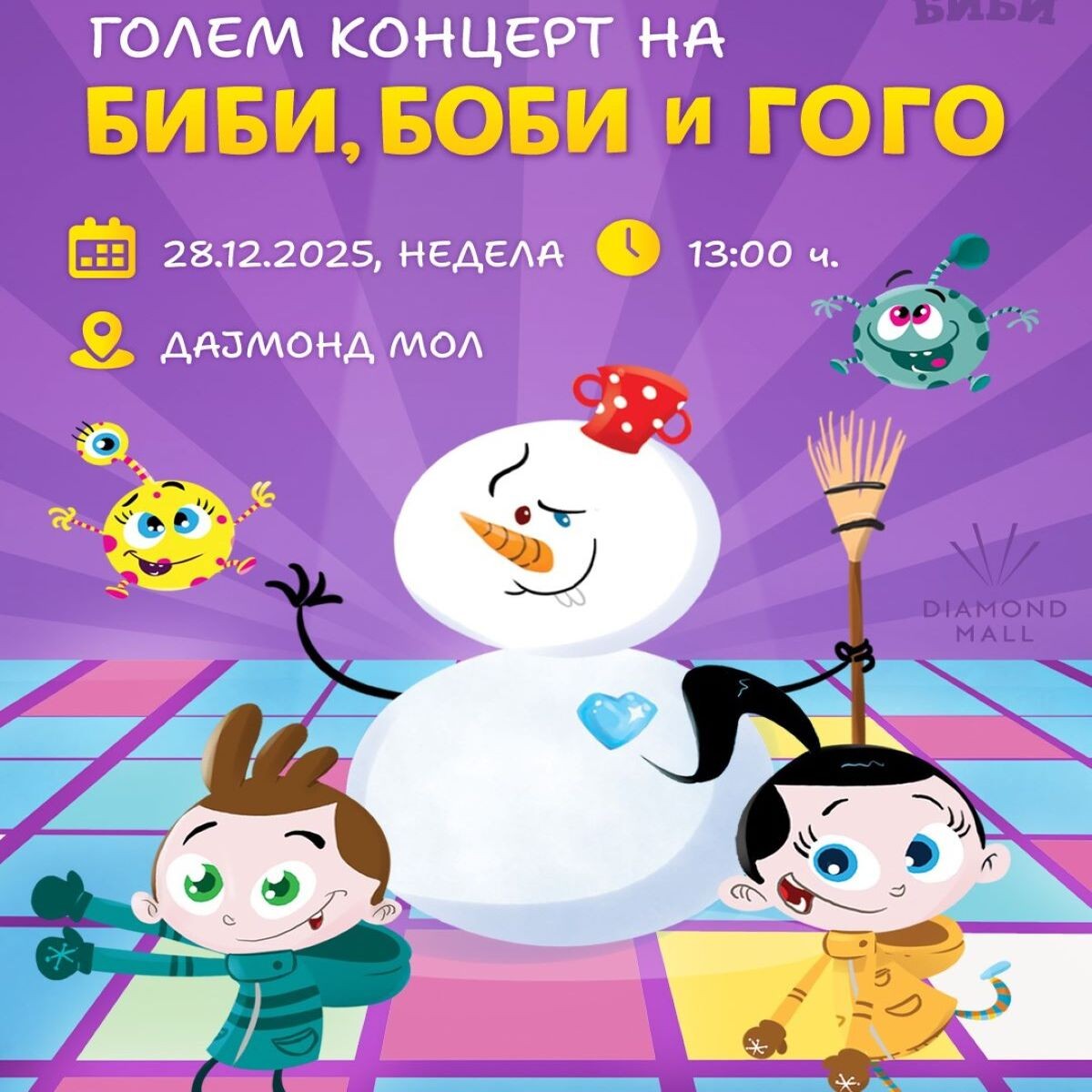 📅 28.12 (Sunday) ⏰ 13:00 ч. Bibi, Bobby and Gogo are waiting for you at a big concert at Diamond Mall 🎶💛
