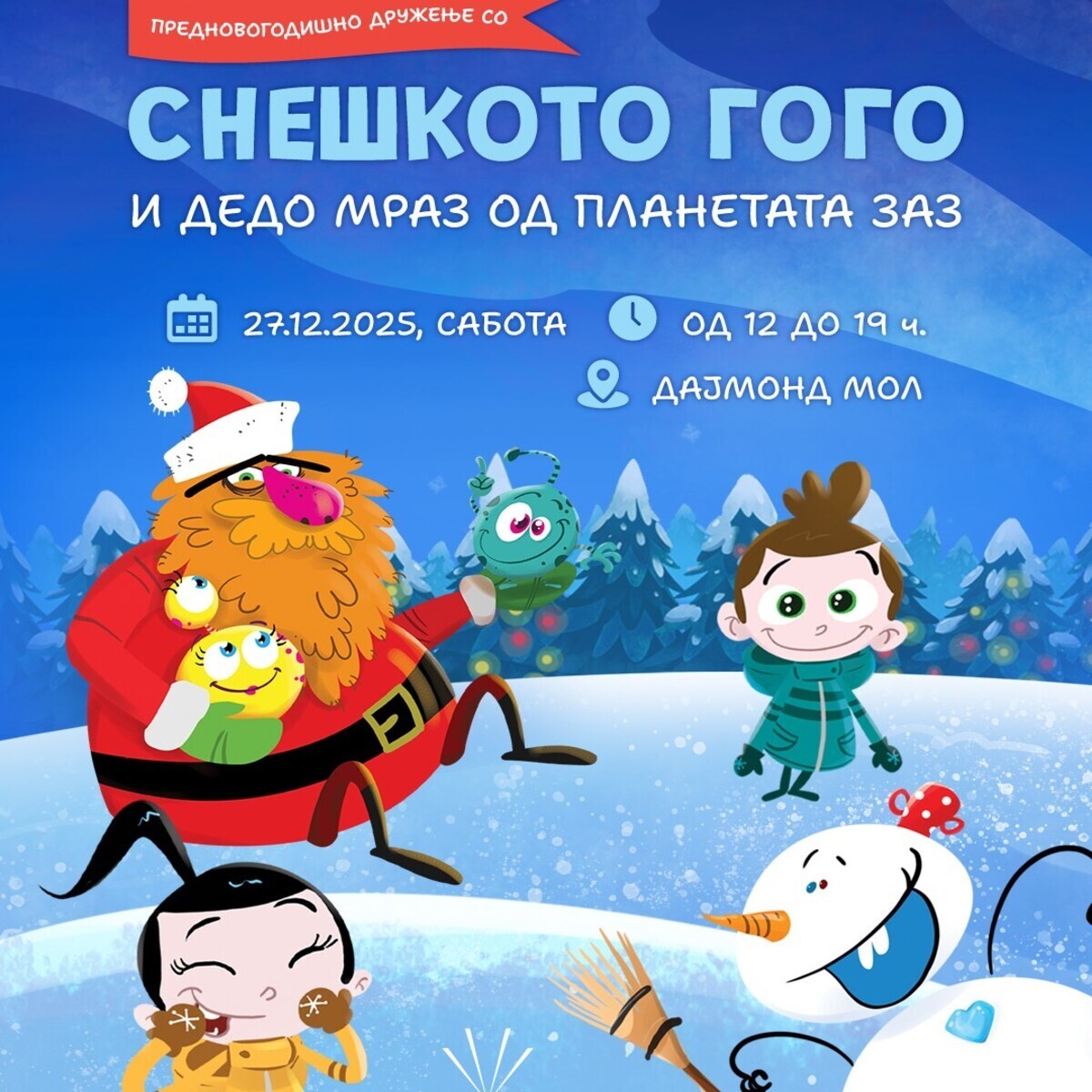 Снешкото Гого и Дедо Мраз од планетата Заз ве покануваат на предновогодишно дружење со Биби и Боби исполнето со радост и многу изненадувања
